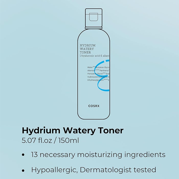 پوست کم‌آب، خسته و ملتهب یکی از علت های بوجود امدن پوست کدر بدون شادابی و دارای چین و چروک میباشد . تونر آبرسان واتری هیدریوم کوزارکس (COSRX Hydrium Watery Toner) یک انتخاب ایده‌آل برای افرادی است که می‌خواهند پوستشان عمیقاً آبرسانی شود، شاداب‌تر به نظر برسد و سد محافظتی آن تقویت گردد.تونر آبرسان هیدریوم کوزارکس یک تونر آبرسان سرشار از ویتامین B5 و اسید هیالورونیک است؛ از این تونر میتوان بعنوان اسپری آبرسان استفاده کرد به این دلیل که پوست را هیدراته و شاداب و شفاف نشان میدهد . وجود مقادیر زیادی ویتامین B5 که به عنوان پانتنول شناخته شده است ،یک عنصر کلیدی که سبب شده تا تونر دارای اثرات مرطوب کننده، بازسازی کننده و ضد التهابی باشد و استفاده از آن برای پوست های مستعد آکنه نیز توصیه شود. تونر COSRX صرفا حاوی مواد مرطوب کننده لازم با 13 ماده مفید دیگر است. این محصول قدرت رطوبت رسانی بالای خود را از کمپلکس Hydrium Synergy-8 که از شش نوع اسید هیالورونیک، دی پانتنول و آلانتوئین تشکیل شده است، بهره میگیرد. مجموعه ای از این ترکیبات آبرسان و مرطوب کننده، پوست را با رطوبت پر می کنند و آن را تا مدت طولانی هیدراته نگه میدارند.